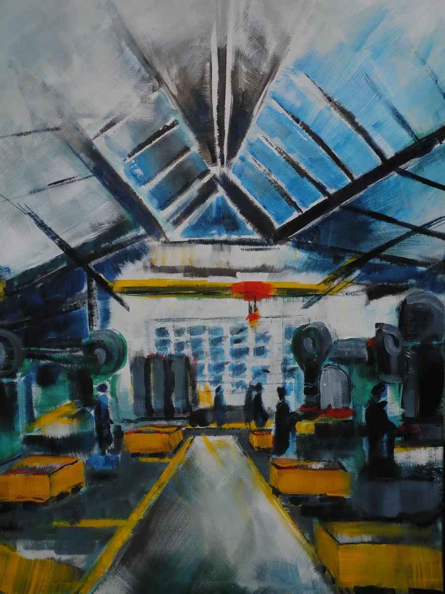 Das mittlere Bild zeigt eine Innenansicht der Maschinenfabrik. Über der Halle ist ein verglaster Dachreiter. Das linke Bild stellt die ruhige Flusslandschaft der Glatt bei der Kolumbanshöhle dar, das rechte Bild zeigt das «Gelbe Haus» an der Untere Fabrik 21 in Herisau mit dem Viadukt und dem Alpstein im Hintergrund. Jedes Bild ist in sich ein Einzelbild; zusammen ergeben sie eine in sich stimmige, ineinander verwobene Gesamtkomposition.